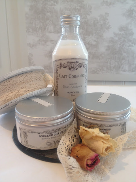 Mycket skön hand- och fotcreme på burk, finns i dofterna fikon och the. Bodylotion på flaska i rosendoft.